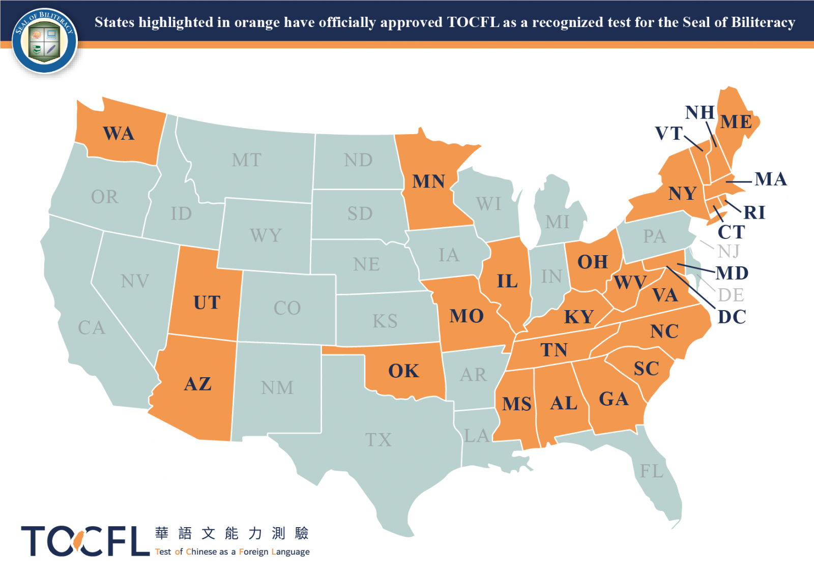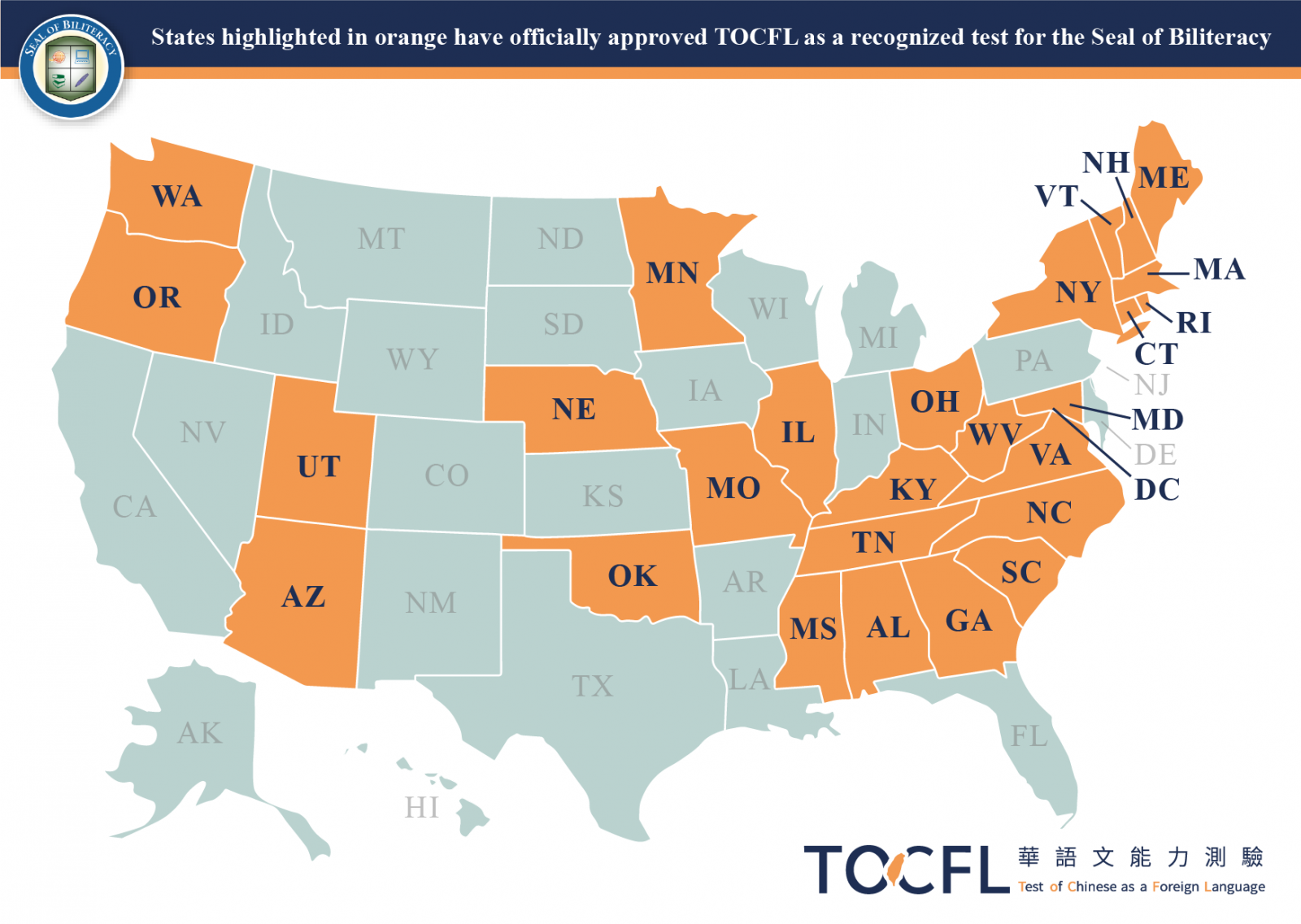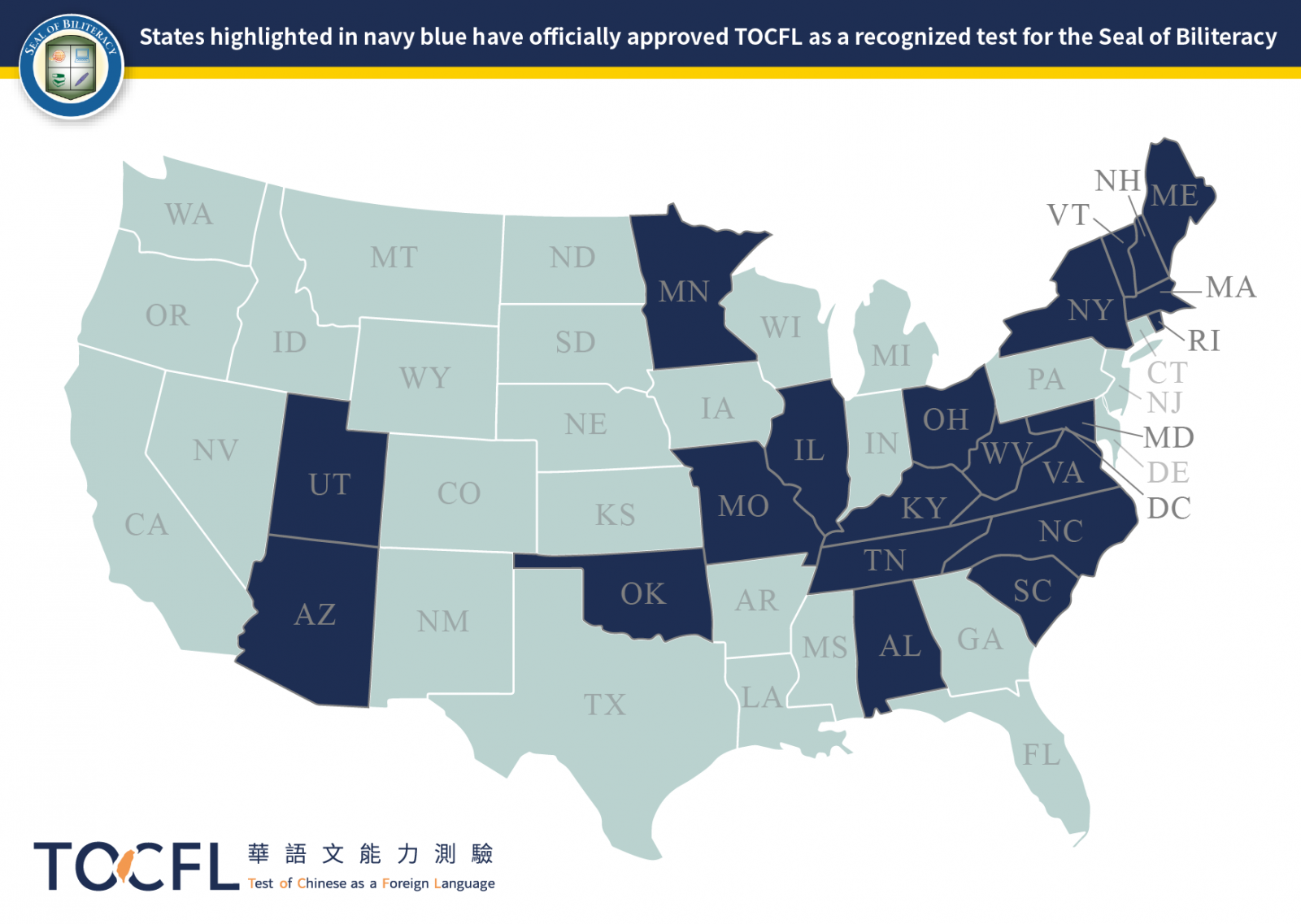 TOCFL 已獲得美國多個州教育廳的認可,作為評估中文能力的標準測驗之一。學生可透過 TOCFL 證明其華語能力,並符合獲頒雙語徽章的資格。目前,以下美國州教育廳已正式採認 TOCFL(更多州別正在評估中,請關注最新公告)。